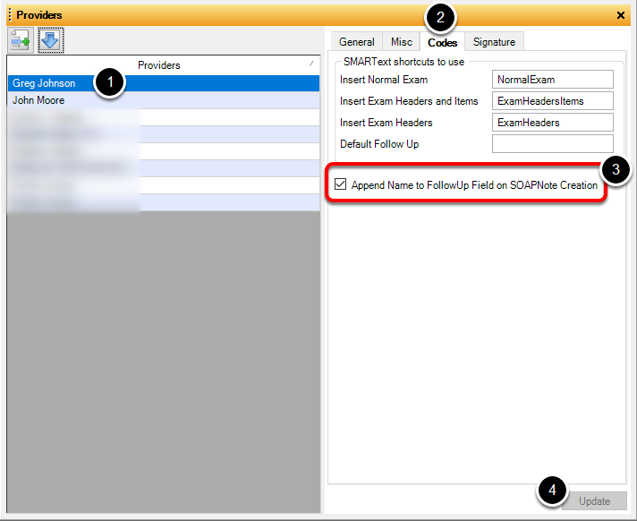 - Select or deselect to Append Name to Follow Up Field on SOAP Note Creation.